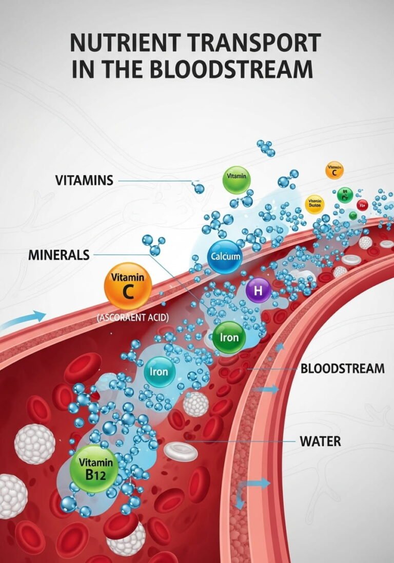 El agua disuelve vitaminas y minerales, facilitando su transporte a través del torrente sanguíneo. Nutrientes como la vitamina C, el complejo B, el calcio, el magnesio y el potasio dependen de la hidratación para llegar a las células.